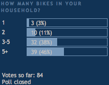 How many bikes in your household? Maybe there are 6 people and only 2 bikes. Maybe you're single and have 6 bikes. Heck, JR has more than 20 all by himself! Whatever the case, I want to see how many you've got.